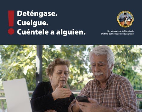 San Diego, California – La Oficina del Fiscal de Distrito del Condado de San Diego lanzó una amplia campaña de difusión con el objetivo de educar a los adultos mayores, sus familiares, cuidadores y al público en general sobre los tipos de estafas que actualmente los tienen como principal blanco. Durante un periodo de un año, los adultos mayores del condado fueron víctimas de fraudes que les costaron más de 130 millones de dólares en diversas estafas telefónicas y en línea. Ante el incremento de estos delitos, la Fiscalía presentó la campaña “Stop. Hang Up. Tell Someone.” (“Detente. Cuelga. Cuéntaselo…