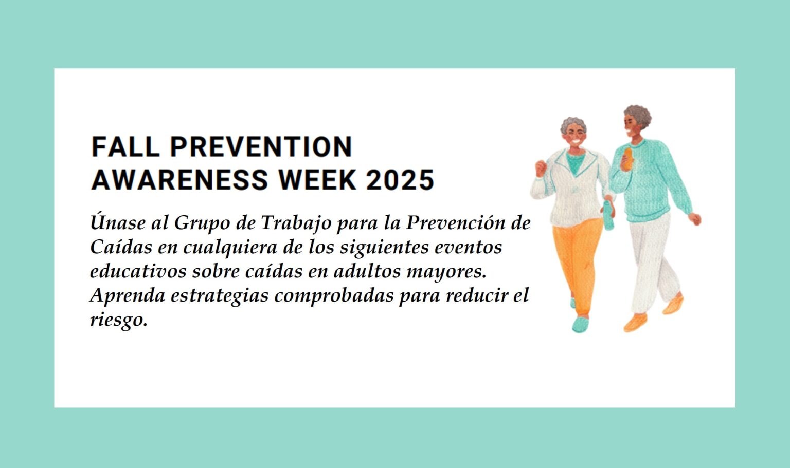San Diego, California — Del 22 al 26 de septiembre de 2025 se conmemora la Semana Nacional de Concientización sobre la Prevención de Caídas, una campaña a nivel nacional que busca informar y educar sobre cómo prevenir caídas, reducir los factores de riesgo y ayudar a los adultos mayores a vivir con confianza y sin miedo a caerse. En San Diego, el Grupo de Trabajo de Prevención de Caídas del Condado, junto con sus socios comunitarios, llevará a cabo una serie de eventos presenciales y virtuales en diferentes puntos del condado. Las actividades incluirán talleres informativos, chequeos de equilibrio, clases…