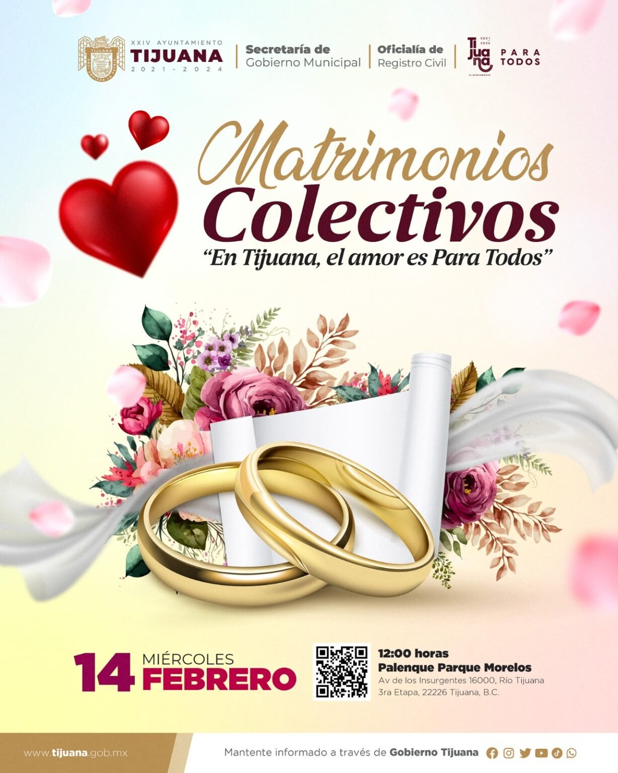 Tijuana, Baja California, a 02 de febrero de 2024 – El XXIV Ayuntamiento que lidera la alcaldesa Montserrat Caballero Ramírez, a través de la Oficialía de Registro Civil, invita a las parejas a formar parte de los Matrimonios Colectivos “En Tijuana, el amor es para todos”, que se realizarán el próximo 14 de febrero en el Palenque del Parque Morelos. La oficial 01 del Registro Civil en Tijuana, Angélica Félix Domínguez, recordó que el 07 de febrero es el último día para entregar los documentos necesarios para celebrar su enlace matrimonial en esta ceremonia, la cual será gratuita y con…