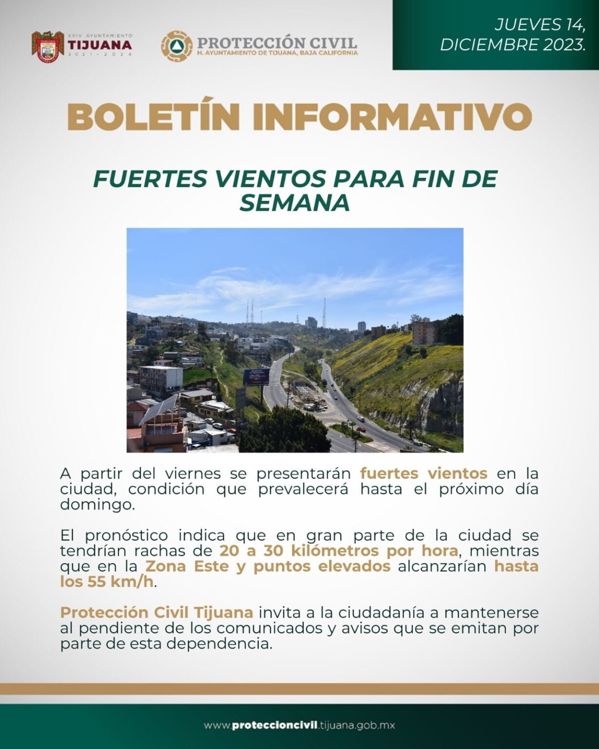 Tijuana, Baja California, 14 de diciembre 2023 – A partir del viernes 15 de diciembre se presentarán fuertes vientos en la ciudad, condición que prevalecerá hasta el próximo día domingo. El pronóstico indica que en gran parte de la ciudad se tendrían rachas de 20 a 30 kilómetros por hora, mientras que en la Zona Este y puntos elevados alcanzarían hasta los 55 km/h. La alcaldesa Montserrat Caballero, a través de Protección Civil Tijuana, emite a la ciudadanía las siguientes recomendaciones: • No quemar basura o pastizales, ni encender fogatas. • Proteger a niños, adultos mayores y personas sensibles a…