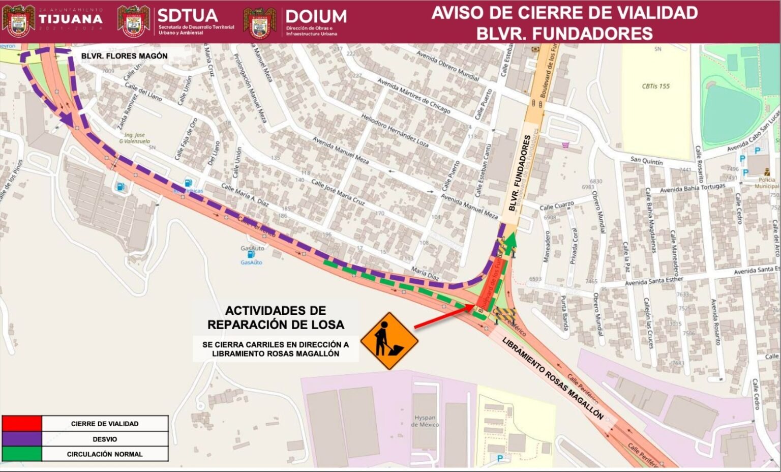 Tijuana, Baja California, 12 de abril de 2023 – La Dirección de Obras e Infraestructura Urbana Municipal (DOIUM) del Ayuntamiento encabezado por la alcaldesa Montserrat Caballero Ramírez, anunció el cierre del cruce del bulevar Fundadores hacia el Rosas Magallón o conocido también como Libramiento Sur. El titular de la DOIUM, Marco Antonio Campoy Arce, informó que el pluvial será reparado luego de colapsarse por un acto de vandalismo, lo que ocasionó la aparición de un socavón en el área que será atendido por seguridad de los ciudadanos. El funcionario explicó que el cierre será a partir de las 8 de…