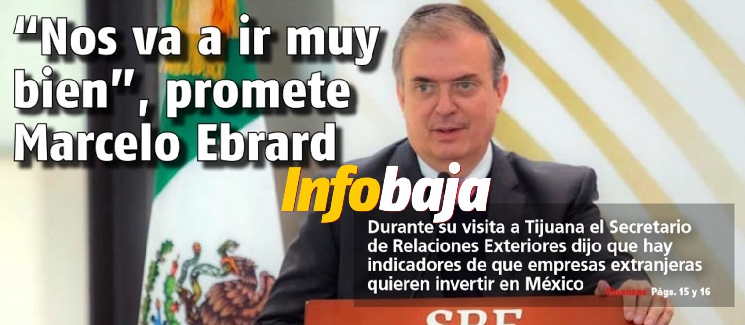 Esta nota es traida a ti por InfoBaja Infobaja, periodismo que vale mucho y no cuesta 1 de diciembre, 2022 Durante su visita a Tijuana el Secretario de Relaciones Exteriores dijo que hay indicadores de que empresas extranjeras quieren invertir en México. Redacción/Infobaja – editorial@infobaja.info Principales – Acciones de su administración han incrementado 87% el pago de utilidades, asegura Gobernadora – Indica 66% que las autoridades no están haciendo un esfuerzo real por combinar la contaminación Más información en www.infobaja.info
