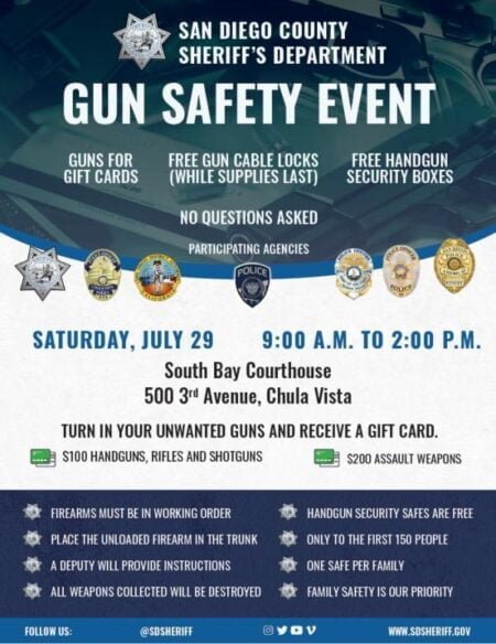 San Diego, California, 26 de julio 2023 – Entregue sus armas y reciba una tarjeta de regalo ($100 para pistolas,…