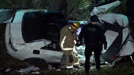 San Diego, California, 23 de enero 2023-Los equipos de emergencia rescataron a dos personas atrapadas en un coche que se…