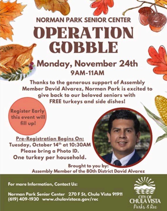 Chula Vista, California — Este lunes 24 de noviembre, de 9:00 a.m. a 11:00 a.m., el Centro de Personas Mayores Norman Park llevará a cabo el evento “Operation Gobble”, una jornada especial en la que se entregarán pavos y guarniciones gratuitas a los adultos mayores de la comunidad.