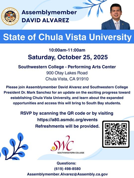 Chula Vista, California — El asambleísta David A. Álvarez invita a la comunidad del sur del condado a asistir al evento State of Higher Education, que se llevará a cabo el sábado 25 de octubre de 10 a 11 a.m. en el Centro de Artes Escénicas de Southwestern College, ubicado en 900 Otay Lakes Road.