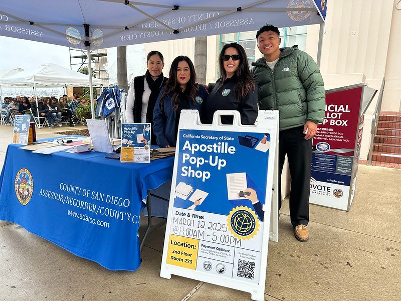 San Diego, California – Ante la creciente demanda, el Secretario de Estado de California, Shirley N. Weber, y el Asesor/Registrador/Secretario del Condado de San Diego, Jordan Z. Marks, han anunciado una nueva edición del exitoso Apostille Pop-Up Shop, que se llevará a cabo el martes 17 de septiembre de 2025, de 8:00 a.m. a 5:00 p.m., en las oficinas del centro del Registro Civil del Condado (1600 Pacific Highway, Suite 273, San Diego). La entrada es libre, no se requiere cita, y hay estacionamiento subterráneo gratuito disponible.