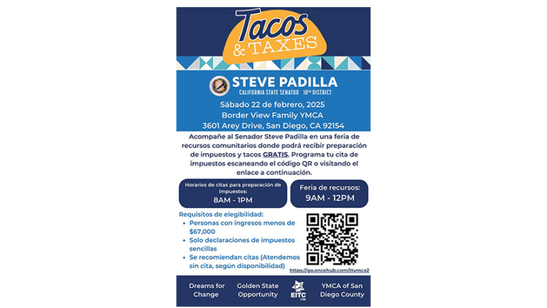El Senador de California por el Distrito 18, Steve Padilla, invit a la comunidad al evento de Tacos & Taxes el sábado, 22 de febrero de 2025 en Border View Family YMCA. ¡Este evento, realizado en colaboración con Golden State Opportunity y Dreams for Change, contará con una feria de recursos de 9:00 am a 12:00 pm, así como con…